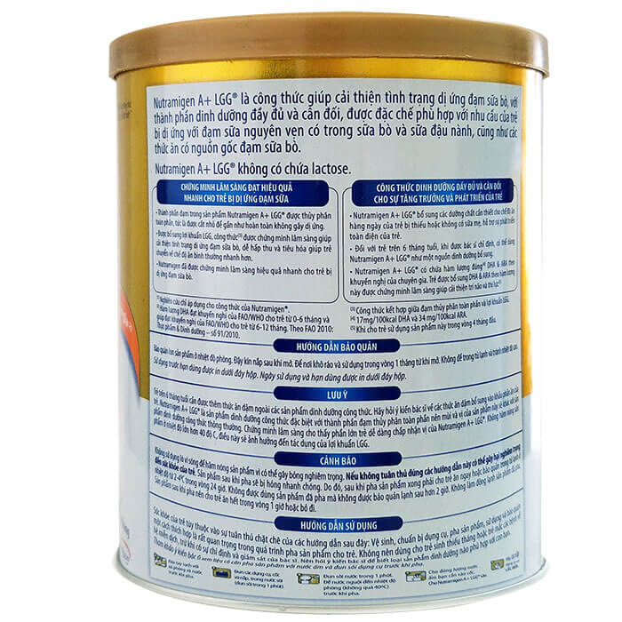 Cải thiện hệ tiêu hóa non nớt: với nhóm tẻ dị ứng đạm sữa bò, hệ tiêu hóa của bé rất “nhạy cảm”. Do đó, trong thành phần của sữa Nutramigen có chứa rất nhiều lợi khuẩn LGG. Đây là chìa khóa quan trọng giúp cải thiện tình trạng dị ứng đạm sữa bò của trẻ một cách triệt để. Từ đó, tăng cường khả năng hấp thụ chất dinh dưỡng, và cải thiện hệ tiêu hóa ổn định.’ Không gây dị ứng đạm sữa bò: sản phẩm sữa đã được chứng minh hoàn hảo về khả năng lành tính, hoàn toàn không gây dị ứng với trẻ có tiền sử dị ứng đạm sữa bò từ 0 – 12 tháng.